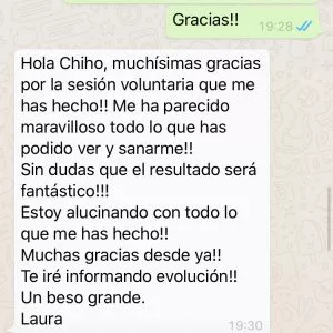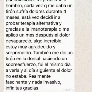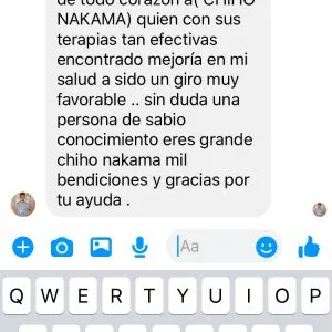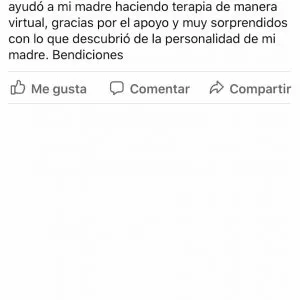 Le hice tres terapias en las que cheque desde emociones y todos los patógenos que pudieran existir en su organismo; realmente encontré muchos bloqueos energéticos, patógenos y limitaciones las cuales las llevé al 7 cielo y la persona empezó a tener cambios maravillosos, su alegría por seguir con sus proyectos que quedaron parados por un instante, por seguir superándose profesionalmente.